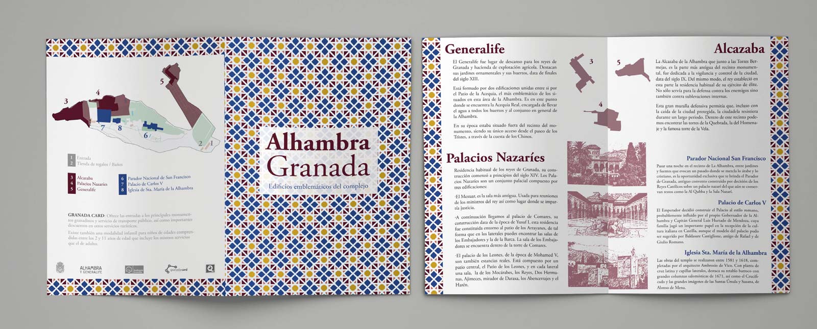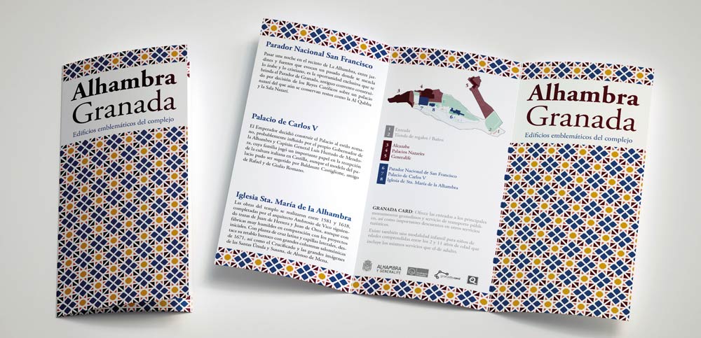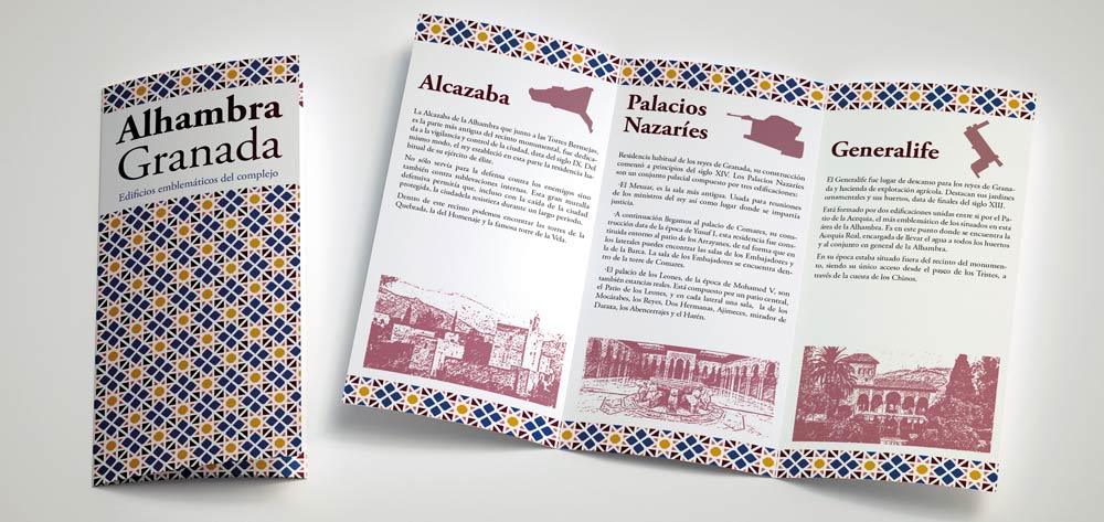 El proyecto consistió en diseñar y maquetar un díptico y tríptico informativos sobre los edificios más emblemáticos de la Alhambra de Granada. Para ello se seleccionarón como edificios principales la Alcazaba, los Palacios Nazaríes y el Generalife. Por otra parte se ha incluido información extra sobre otros edificios como la Iglesia de Sta. María de la Alhambra, el Palacio de Carlos V y el Parador Nacional de San Francisco.