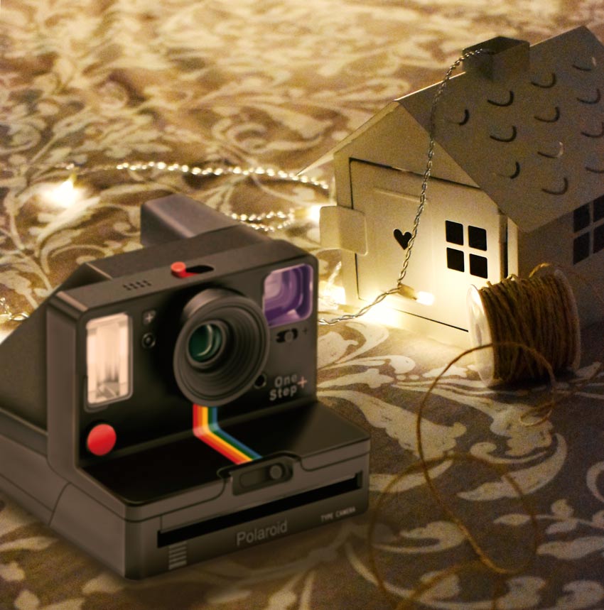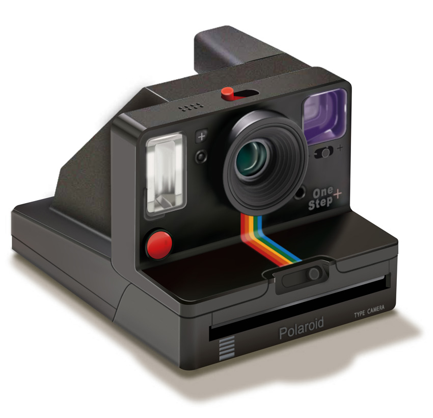 Ilustración vectorial de la cámara Polaroid One Step realizada con Adobe Illustrator. La ilustración se incorporó en una fotografía mediante Adobe Photoshop. Esta pieza pertenece a un calendario y corresponde al mes de diciembre. La fotografía al igual que la ilustración, es obra propia.